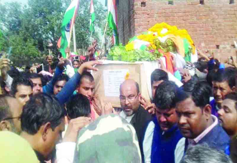 After the mortal remains of the martyr reached his residence at Harpur Belhiya Tola village in the district, the people of the village tried to console his wife Rohini, mother Sushila, father Om Prakash Tripathi and younger brother Shubham. The last rites of the Jawan were performed at the Trimuhani ghat of Rohini river at 1400 hrs on Saturday. Huge number of people were present at the spot who raised slogans like ‘Bharat Mata Ki Jai’ and ‘Veer Jawan Amar Rahe.’