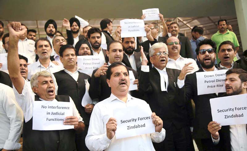 Lawyers protesting in District Court Complex at Janipur on Friday. -Excelsior/ Rakesh