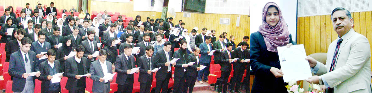 The oath was administered by Member, J&K State Judicial Academy Governing Committee Justice Sanjeev Kumar, who also distributed absolute enrolment certificates among 123 newly enrolled advocates hailing from different districts of Kashmir province. This was followed by lecture on the “Professional Ethics, Behaviour and Conduct” delivered by Justice Sanjeev Kumar.