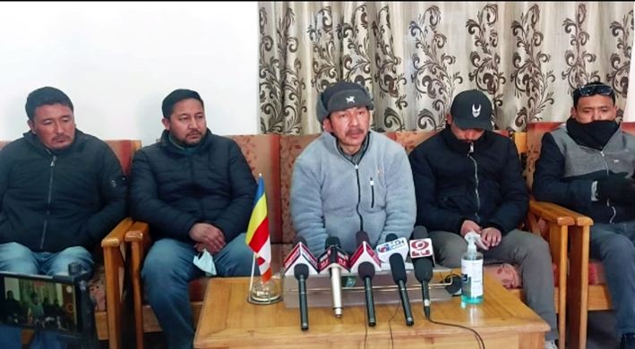 LBA Youth Wing president Rigzin Dorjay flanked by other executive members addressing a press conference in Leh on Wednesday. -Excelsior/Morup Stanzin