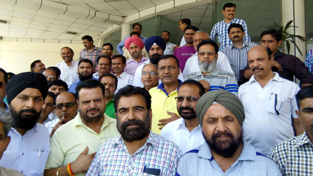 Leaders and activists of Government Employees Joint Action Committee holding protest outside the office of the Divisional Commissioner Jammu.