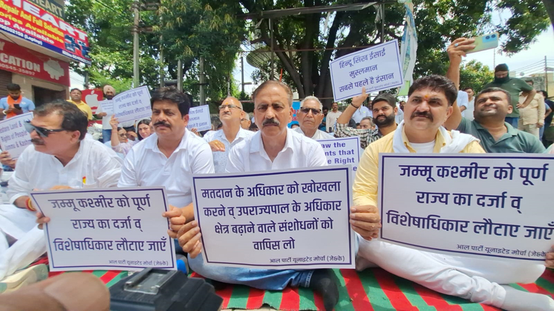 The protest under the banner of All Party United Front saw participation from all the leaders and workers of different parties including Congress, NC, Shiv Sena (UBT), PDP, S Akali Dal, AAP, CPI(ML), CPI, AIPA, HRS and other parties.