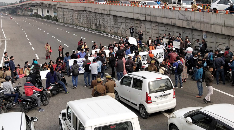Shouting slogans and carrying placards in support of their demand for revocation of the controversial Government order, the protesting lecturers held a massive demonstration in front of the GCW Gandhi Nagar thus disrupting vehicular movement there for some time. Later they marched towards the civil Secretariat but Police did not allow them to proceed further.