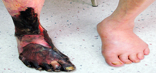 Gangrene occurs when the blood supply to the leg is severely affected. The toes become black and may need amputation. The blood supply needs to be restored before cutting the toes or else the cut area also becomes gangrenous, eventually requiring amputation.