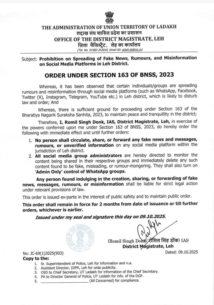 As per an order issued by diatrict admin Leh, Under Section 163 of the Bharatiya Nagarik Suraksha Sanhita (BNSS), 2023, the order directs all social media users to refrain from sharing, forwarding, or posting unverified content. Group administrators on platforms such as WhatsApp, Facebook, X (Twitter), Instagram, Telegram, and YouTube have been instructed to monitor their groups, delete misleading content, and enable “Admin Only” controls where applicable.