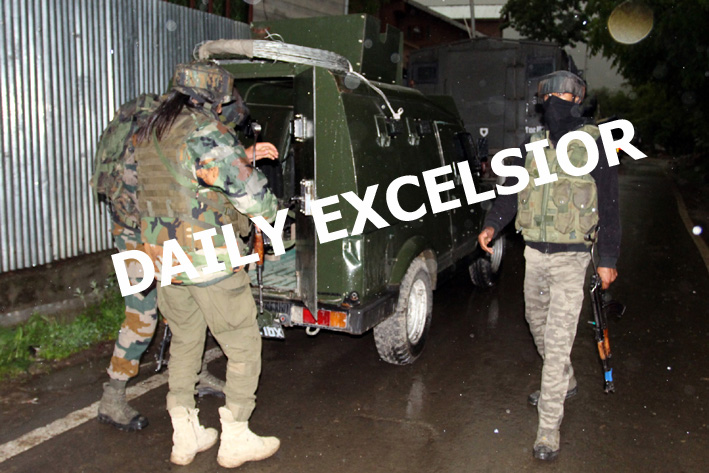 Security forces during encounter at Kunzar, Baramulla on Thursday. —Excelsior/Aabid Nabi