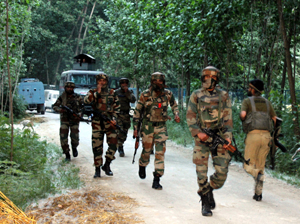 Troops rush towards encounter site at Reshipora in Pulwama on Sunday. —Excelsior/Younis Khaliq
