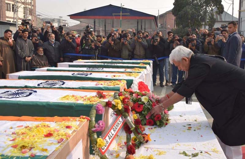 Chief Secretary Atal Dulloo, NIA Director General Sadanand Date, DGP Nalin Prabhat, General Officer Commanding of the Army’s 15 Corps, Lt Gen Prashant Srivastava, and other officers from civil administration, police, and other security forces and agencies also paid floral tribute to the police personnel killed in the blast.