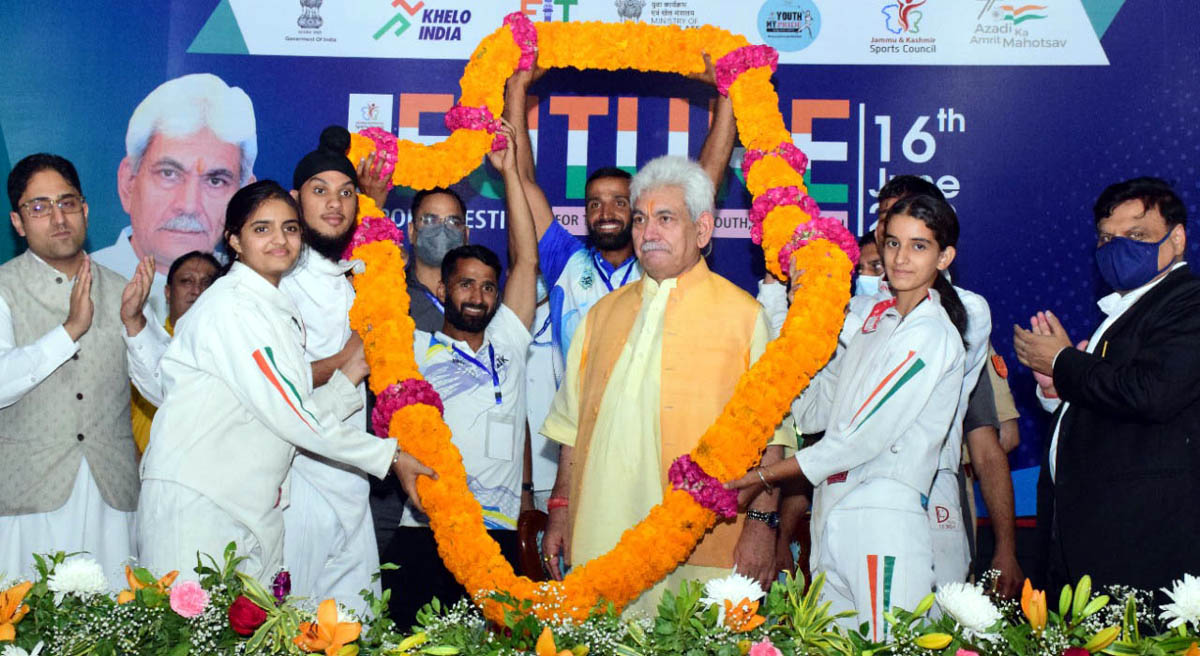 The Lt Governor congratulated noted sportspersons of Jammu and Kashmir who have brought laurels to the UT at various national and international levels in the last few months. He made a special mention of cricketer Umran Malik; Beijing Olympian, Arif Khan; Wushu Gold Medalist, Sadia Tariq; Cyclist Adil Altaf; Rakshanda Mehak; Rakesh Kumar; Chandeep Singh and footballer Ishan Pandita.