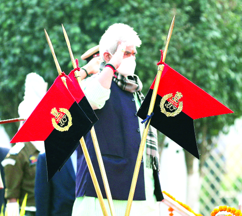 Lieutenant Governor Manoj Sinha takes salute at the guard of honour during opening of Civil Secretariat in Jammu on Monday. -Excelsior/Rakesh