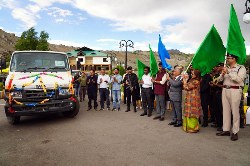 KARGIL, July 28: Lieutenant Governor of Ladakh, Brigadier (Dr) BD Mishra (Retd), along with First Lady Neelam Mishra, today inaugurated 9 waste pickup trucks purchased by the Rural Development and Panchayati Department (RD&PD) at the Tourist Facilitation Centre in Kargil.