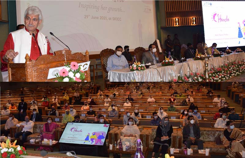 Srinagar, June 29: In a historic effort aimed at harnessing the energy, enthusiasm, and exuberant dreams of the women of Jammu & Kashmir, Lieutenant Governor Manoj Sinha today launched the “Hausla inspiring her growth”, a comprehensive programme for Catalysing Women Entrepreneurship in the UT, at SKICC Srinagar.