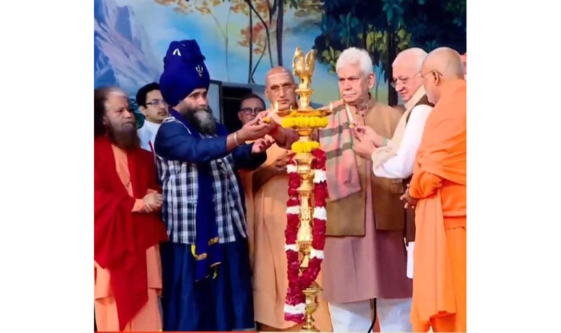 LG Manoj Sinha alongwith other spiritual seekers lighting ceremonial lamp during Divya Adhyatmik Mahotsav at Haridwar on Tuesday.