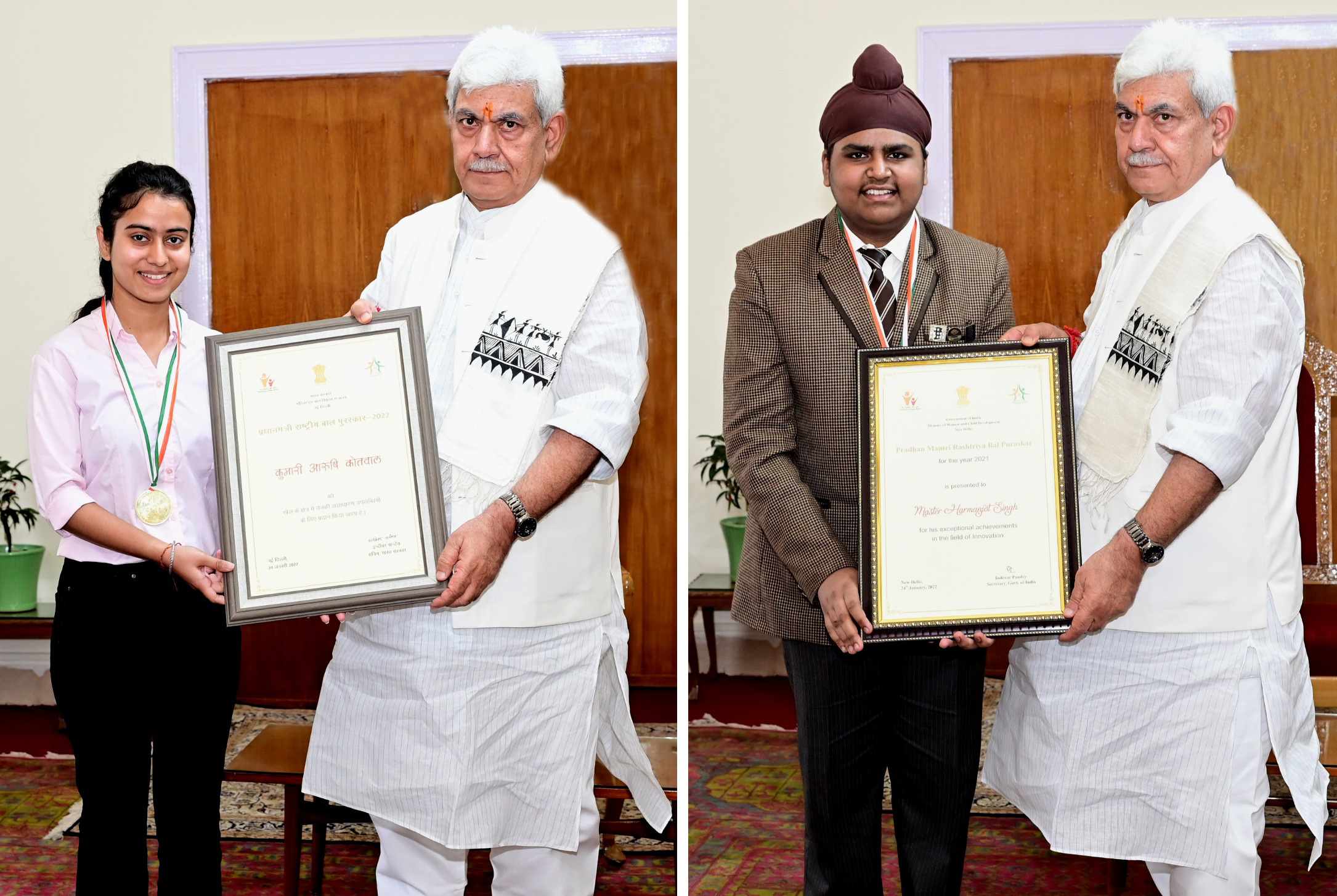 JAMMU, Mar 10: Lieutenant Governor Manoj Sinha honoured Arushi Kotwal and S. Harmanjot Singh, awardees of Pradhan Mantri Rashtriya Bal Puraskar for the year 2022 and 2021 respectively, at the Raj Bhavan today.