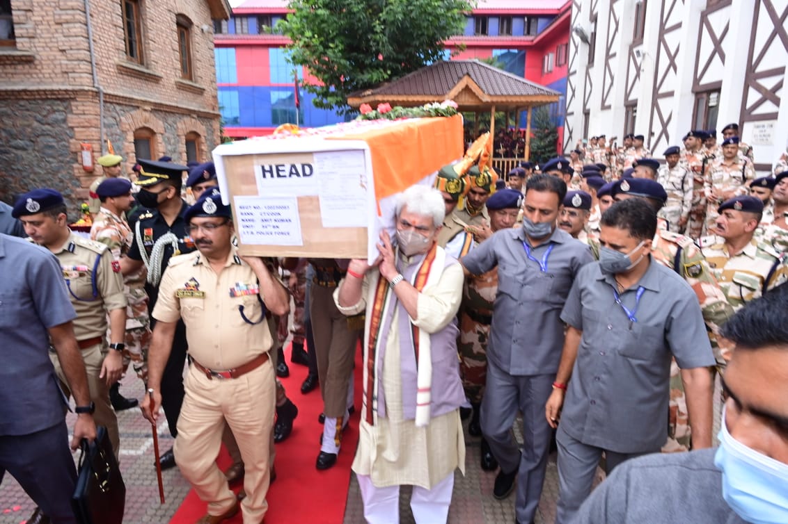 Srinagar, August 17: Jammu and Kashmir Lieutenant Governer Manoj Sinha lent his shoulder to the mortal remains of ITBP jawans at the wreath-laying ceremony at the DPL Srinagar on Wednesday.