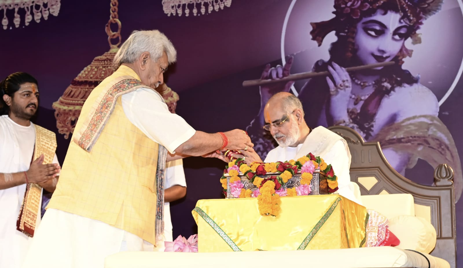 Katra, May 16: Lieutenant Governor Manoj Sinha today attended Shrimad Bhagavat Katha by Pujya Bhaishri Rameshbhai Oza Ji at Shri Mata Vaishno Devi Spiritual Growth Centre, Katra.
