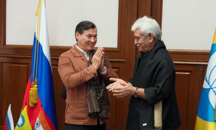 SRINAGAR, Oct 18: The Lieutenant Governor Manoj Sinha met His Excellency Mr. Batu Sergeyevich Khasikov, Head of the Republic of Kalmykia, Russia today and discussed various issues related to cultural, spiritual ties. The Lieutenant Governor thanks His Excellency for facilitating the grand visit of holy relics of Lord Buddha.