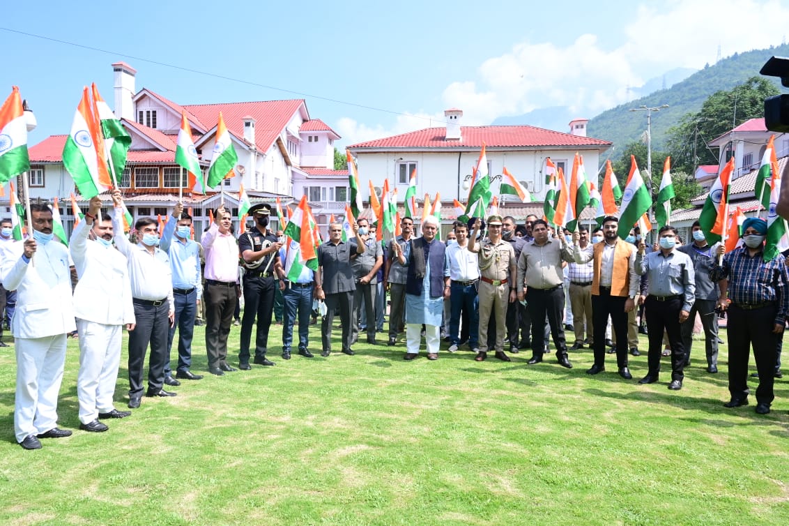 Srinagar, August 13: Lieutenant Governor Manoj Sinha today started the Har Ghar Tiranga campaign in Jammu Kashmir by distributing National flags among the Raj Bhawan staff here.