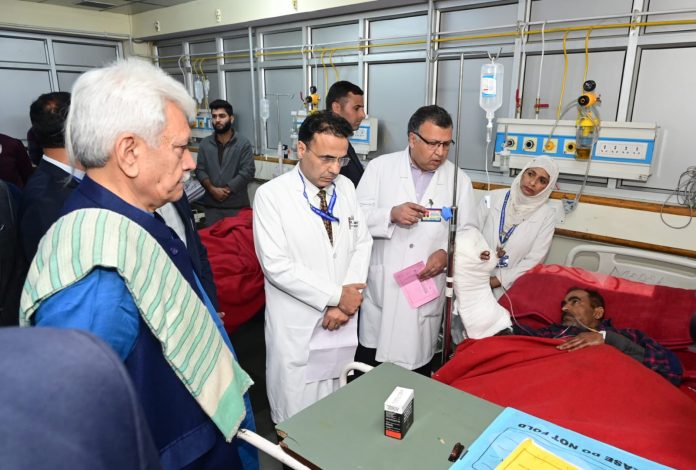SRINAGAR, Oct 21: Jammu and Kashmir Lieutenant Governor Manoj Sinha visited a hospital in Srinagar to inquire about the condition of construction workers injured in the Gagangir terror attack.
