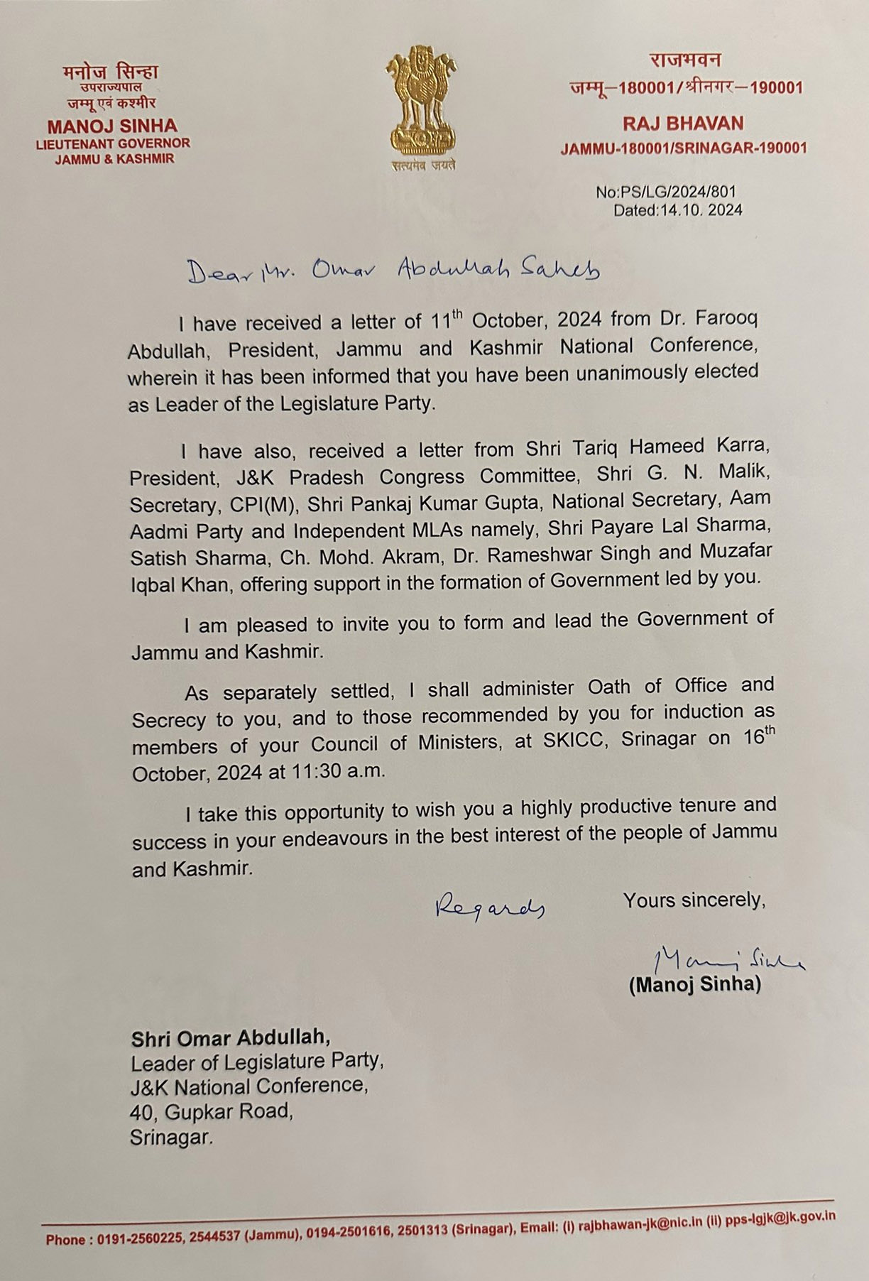 JAMMU, Oct 14: Jammu and Kashmir National Conference Vice-President and Chief Minister designate Omar Abdullah has received a letter from the Lieutenant Governor Manoj Sinha to form the Government.