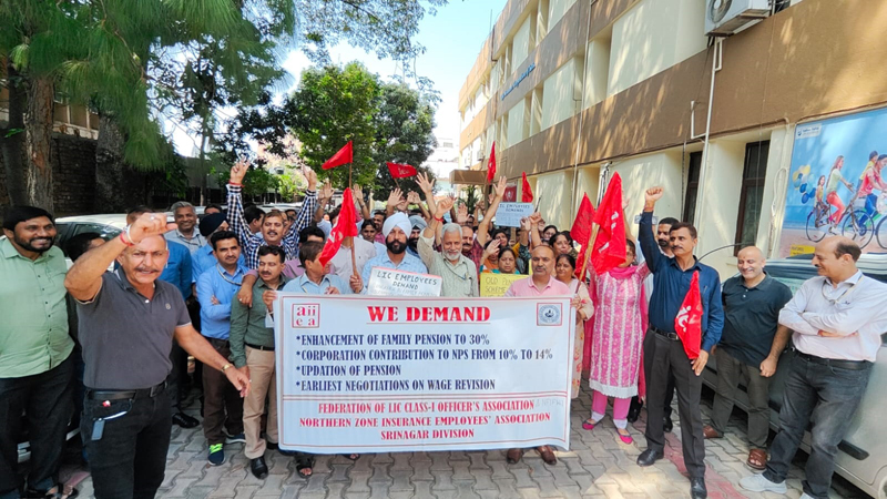 JAMMU, Aug 30: LIC Class-1 officers under the banner of Federation of LIC Class-1 Officers’ Association led by its Secretary, Vijay Khajuria and president Jatinder Bhat, Development Officers under the banner of NFIFWI led by its president, Rakesh Magotra, and LIC Class-3&4 employees under the banner of Northern Zone Insurance Employees’ Association led by Divisional Secretary, Pawan Gupta and president, Fayaz Ah Gul held massive demonstrations today across LIC offices of Jammu & Kashmir in support of their long pending demands.