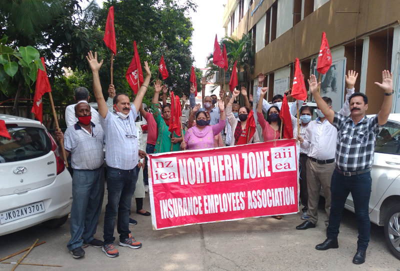 JAMMU, Aug 4: Life Insurance Corporation (LIC) employees under the banner of Northern Zone Insurance Employees’ Association Srinagar Division as per the call of All India Insurance Employees’ Association held massive demonstrations today in front of LIC offices of Jammu & Kashmir against privatization of United India Insurance Company.