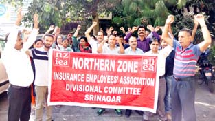 JAMMU, Oct 11: On the call given by All India Insurance Employees’ Association, Northern Zone Insurance Employees’ Association Srinagar Division represented by LIC employees of Jammu & Kashmir, held massive demonstrations today in front of LIC offices to oppose the decision of the NDA Govt to disinvest 14.22% of shares of General Insurance Corporation of India (GIC Re) through IPO (Initial Public Offer).