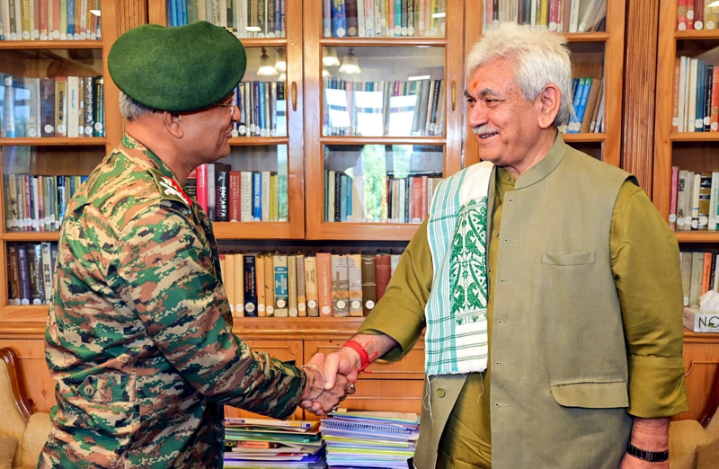 Lieutenant Governor Manoj Sinha during meeting with Lt Gen Prashant Srivastava.