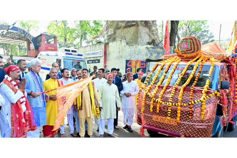 Lieutenant Governor Manoj Sinha flagging off Shri Mata Vaishno Devi Ji Pracheen Marg Pavitra Chhari Yatra from Nagrota on Monday.