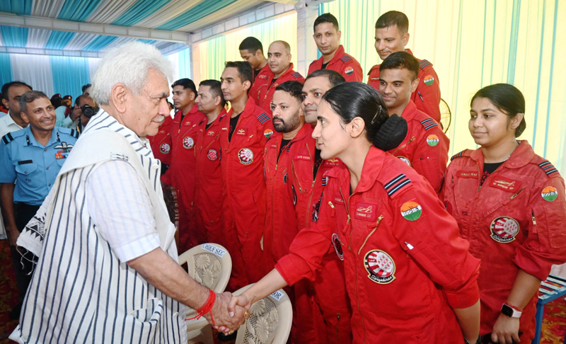 Lieutenant Governor Manoj Sinha interacting with Surya Kiran Team of Indian Air Force during the air show in Jammu Air Force Station on Friday. – Excelsior/Rakesh