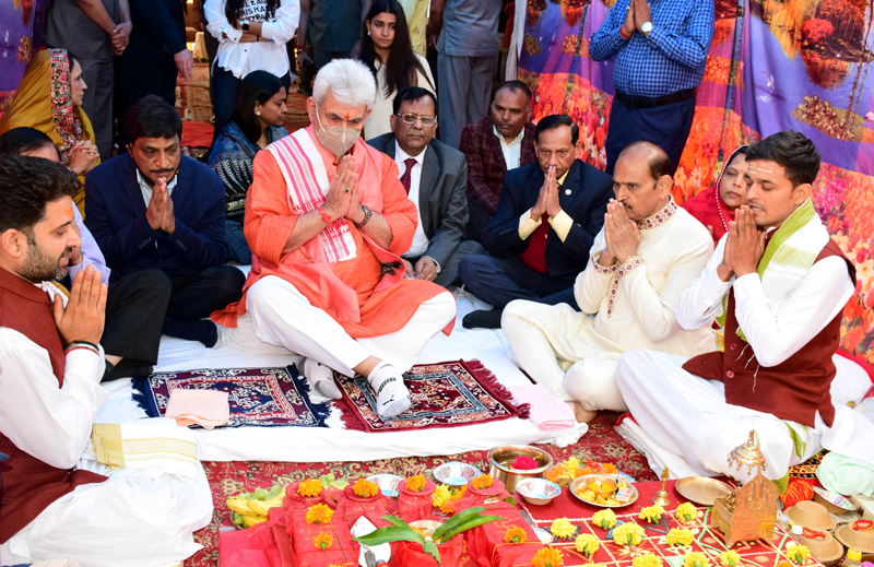 Lieutenant Governor Manoj Sinha performing ‘Bhoomi Pujan’ of Yatri Niwas of SASB at Srinagar on Tuesday.