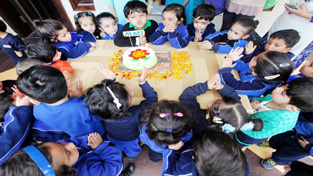 Little Montessorians of MMI Pre School, Jammu branch celebrating 1st foundation day of the school with cake cutting ceremony.-Excelsior/ Rakesh