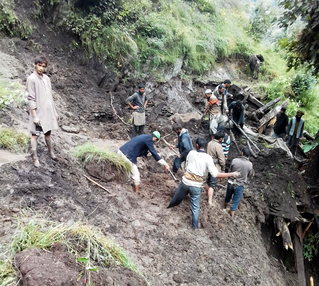 Locals clearing the debris to retrieve the dead bodies in Gandoh, Doda on Monday. -Excelsior/Rafi Choudhary