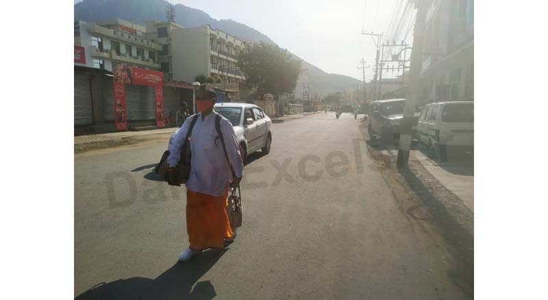 Lone pilgrim walks on Katra road as yatra to holy cave shrine of Mata Vaishno Devi Ji dipped to just 475 on Friday due to surge in COVID cases. Of 475, 39 yatris proceeded to Bhawan by helicopter. Few yatris who reached Katra had to face enormous inconvenience as district Reasi administration ordered closure of dhabas during lockdown.