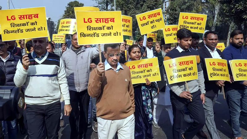 During the march, the AAP MLAs raised slogans against the LG for allegedly objecting to the government’s proposal of sending teachers to Finland. They were seen carrying placards urging Saxena to allow it.