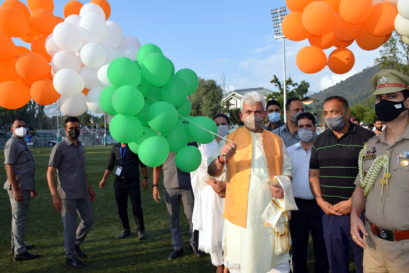 LG Manoj Sinha releasing balloons while declaring open Independence Day Sports Week at TRC Ground in Srinagar.