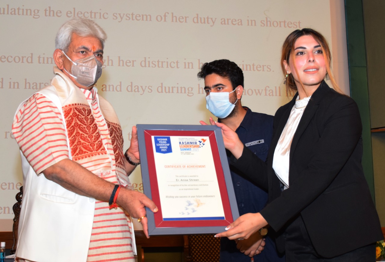 SRINAGAR, Sept 12: Lieutenant Governor, Manoj Sinha today felicitated Young achievers with the ‘Kashmir Young Leadership Award’ during the Kashmir Leadership Summit here at SKICC.