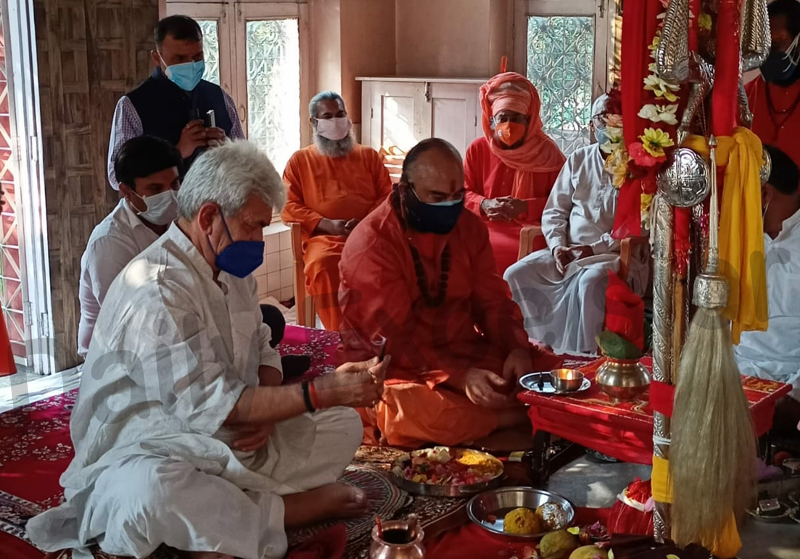 Lt Governor Manoj Sinha and Mahant Deependra Giri Ji performing Chhari Mubarak Pujan at Mahadev Gir Dashnami Akhara, Srinagar on Friday. —Excelsior /Shakeel