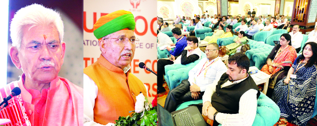 Lt Governor Manoj Sinha and Union Minister of State for Culture & Parliamentary Affairs Arjun Ram Meghwal addressing North Zone MSME conclave at Jammu on Sunday.