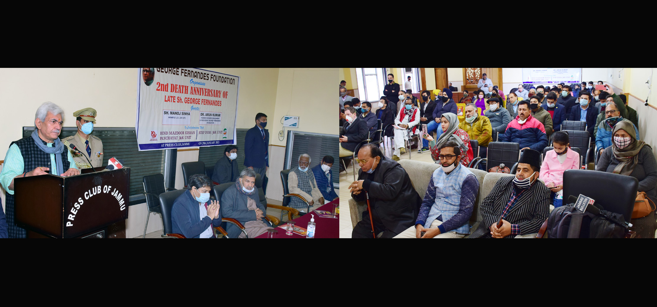 JAMMU: Lieutenant Governor, Manoj Sinha today paid floral tributes to the former Defence Minister, George Fernandes during his second death anniversary commemoration conclave organized by George Fernandes Foundation, in collaboration with Hind Mazdoor Kissan Panchayat, J&K Unit and Step India J&K Unit at Press Club.