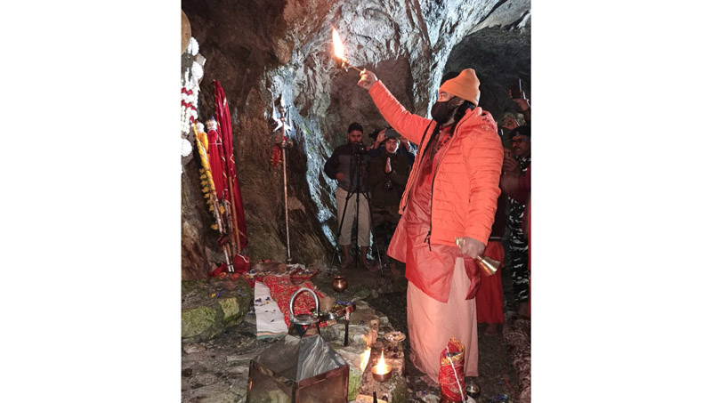 JAMMU, Aug 12: Lieutenant Governor, Manoj Sinha performed the ‘Samapan Puja’ which marks the end of annual Shri Amarnath Ji yatra, and prayed for peace, progress and prosperity of the people while the Chhari Mubarak of Lord Shiva led by Mahant Deependra Giri Ji and Sadhus also performed darshan at holy cave early this morning.