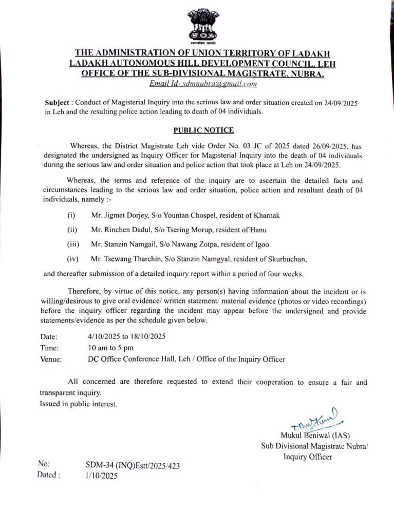 The inquiry was ordered by the Leh deputy commissioner, who appointed Sub Divisional Magistrate Nubra Mukul Beniwal as inquiry officer.