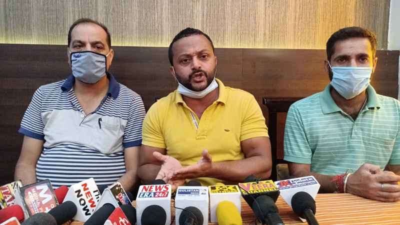 Cong leader Sumeet Magotra, flanked by others addressing press conference at Udhampur.