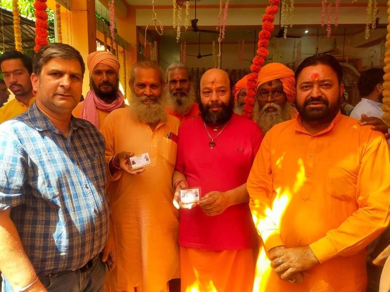 JAMMU, Aug 26: BJP Health and Medical Cell Convener J&K, Puneet Mahajan along with Shatdarshan Sadhu Samaj Sangathan Mantri J&K, Rajesh Ghiri; Swami Mahadev Ghiri, Krishan Bharati, Mohan Bharati and other members of Health & Medical Cell team distributed Ayushman Bharat Golden Cards to the saints of J&K.