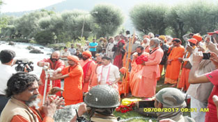Mahant Deependra Giri Ji and Sadhus performing last rituals of annual Swami Amarnath Yatra on bank of river Lidder at Pahalgam on Wednesday.