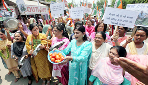 The women Congress workers raised slogans against Prime Minister Narendra Modi, BJP National president Amit Shah, Finance Minister Arun Jaitley, State BJP-PDP Government and alleged that they have  miserably failed to control the price hike. They said that general people have been befooled by the BJP with the slogan of ‘Achhe Din’ but the people  are now realising that they have been deceived by the slogan mongers. The sharp hike in diesel and petrol has also badly affected the prices of vegetables. The prices of  pulses have also gone sky high and now a common man can not afford even pulses.