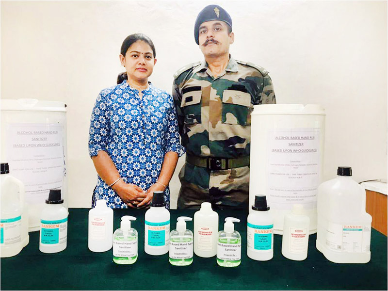 Major Rohit Rathee and his wife Srishti Singh with bottles of sanitizer they have prepared at Rathnuchak Military Station in Jammu on Saturday.(UNI)