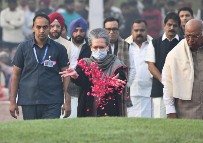 New Delhi, Nov 14: Congress President Mallikarjun Kharge and Congress Parliamentary Party Chairperson Sonia Gandhi paid floral tribute to former Prime Minister Jawaharlal Nehru on his birth anniversary at Shantivan in the national capital on Tuesday.