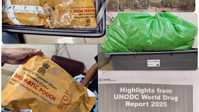 The contraband was concealed inside envelopes bearing purported Ministry of External Affairs markings and sealed with official MEA tape, he said, adding that the trolley bag also contained copies of various UNODC and fake “top secret mission” reports.