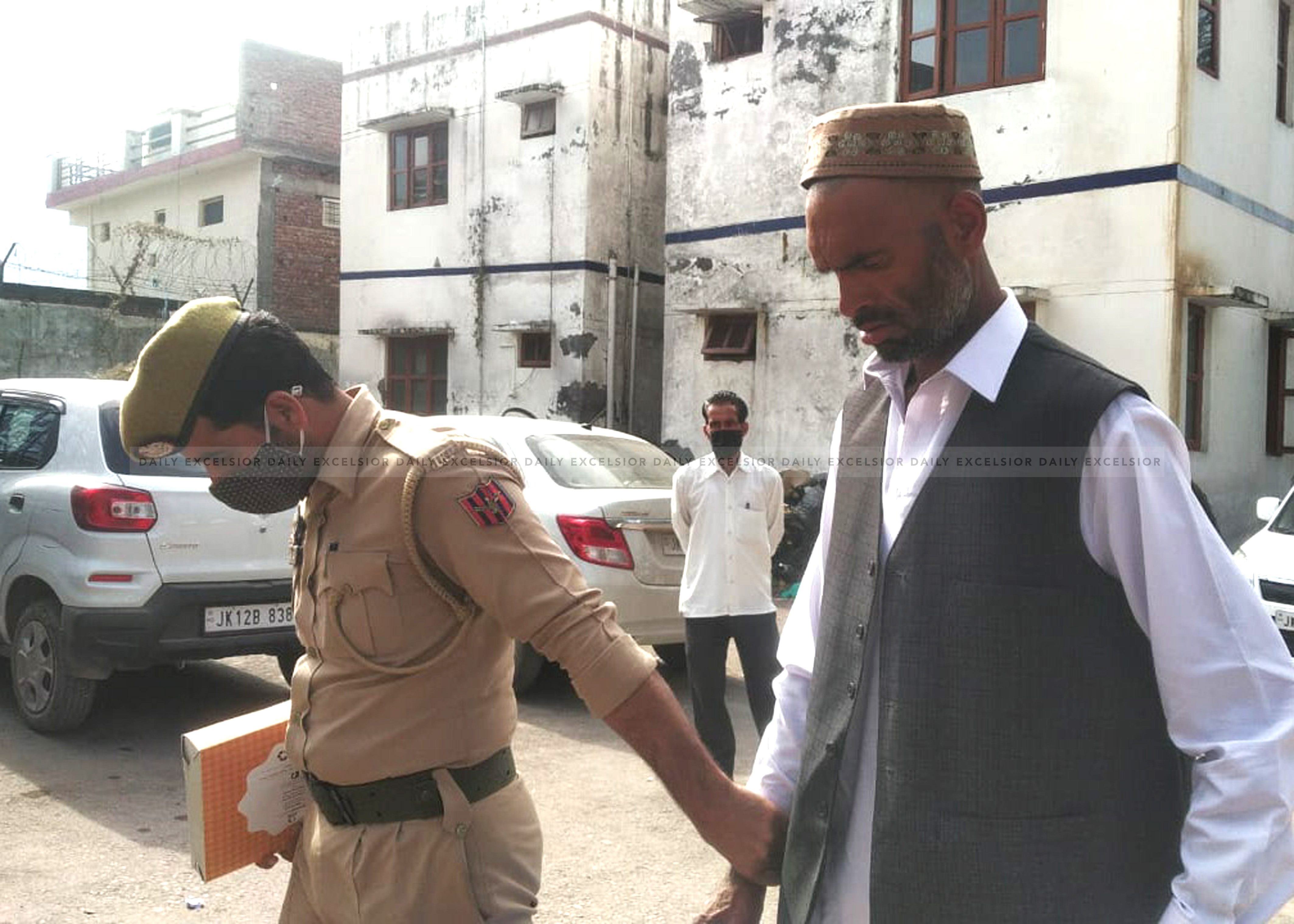 A police personnel taking a person handed over by Pakistan authorities who was inadvertently crossed LoC, at Chaka-Da-Bagh in Poonch on Monday.